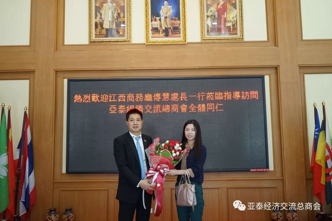 首先李胜交会长致欢迎词:尊敬的江西省商务厅商贸合作招商引资考察团傅慧团长 尊敬的考察团各位领导和企业家 尊敬的泰中江西总商会江淇会长以及杨莉秘书长、卢丹雅执行秘书长尊敬的本会名誉顾问安那上将亲爱的本会各位同仁,大家下午好!