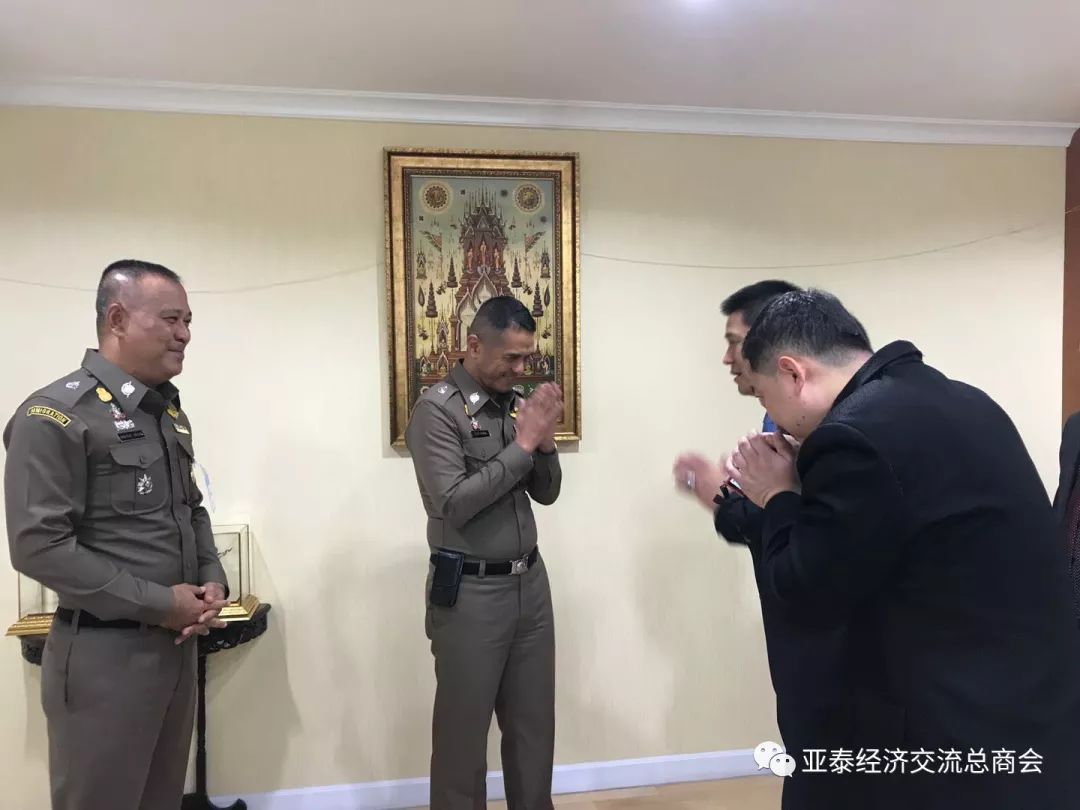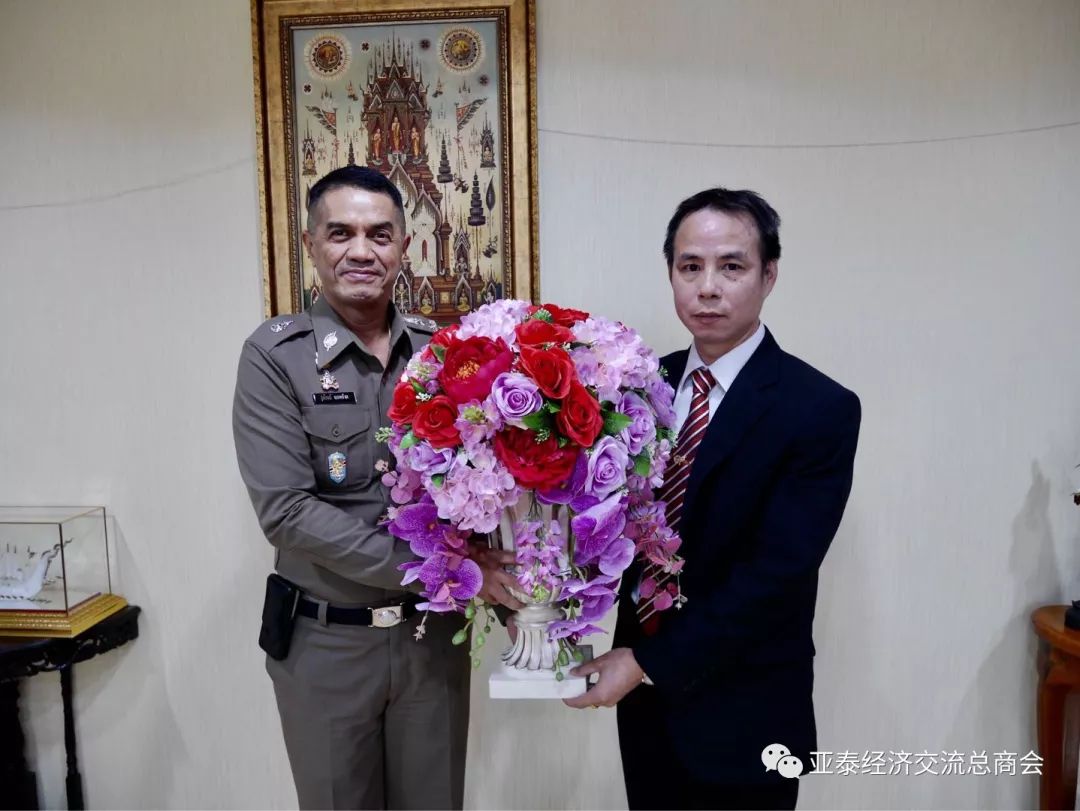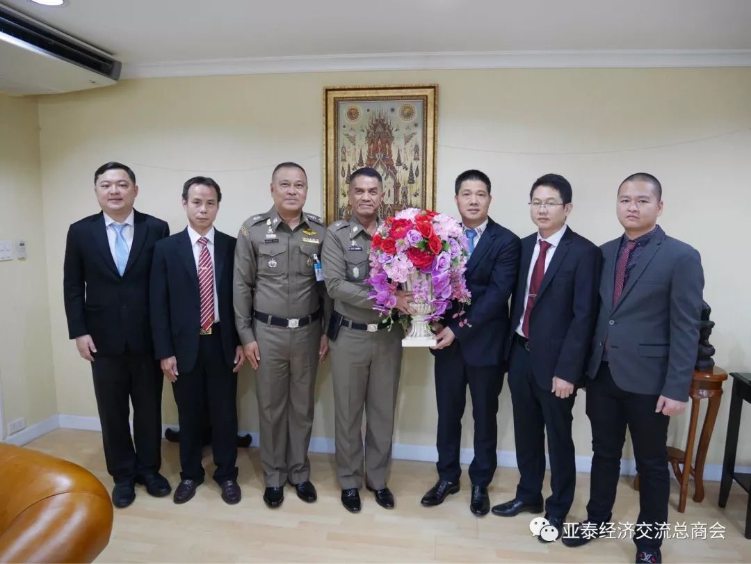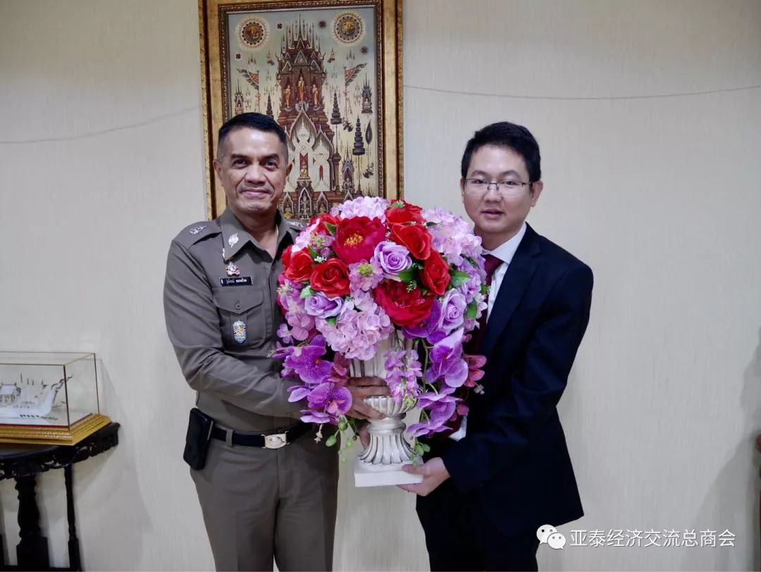 时下春节将临,新春气息勃发,祥云瑞彩呈现,亚泰经济交流总商会又有了新的发展。2019年1月30日上午11时,李胜交会长偕同本会常务副会长陈锦潮、郑友民、副会长邱俊杰、秘书长袁冰,携上花篮,在同是本会名誉顾问、泰国第五区移民局长蓬阿喃警少将的陪同下,前往国家警察总署,拜访副总署长论洛警上将,向其祝福新禧并敦请其出任本会名誉顾问。