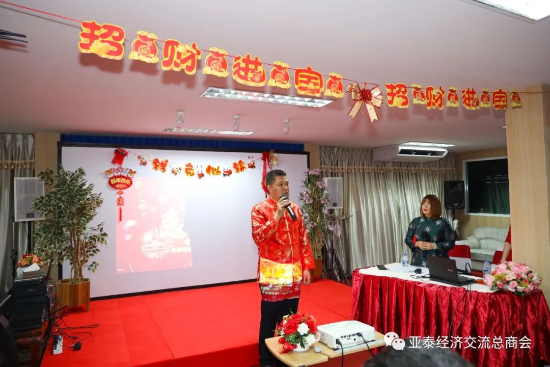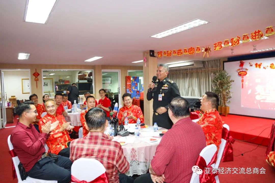 联欢大会由李胜交会长主持,亚泰经济交流总商会名誉顾问、泰国国防部次长参谋主任塔纳帕·倪雅军上将、还有吉滴帕·诗翁警上校、泰国洪门总会会长吴南江作为贵宾应邀出席,亚泰理事同仁出席踊跃,济济一堂。 在活动开始之前,恰逢泰国华人报侨团编辑记者联谊会郑升辉会长带领《星暹日报》、《世界日报》、《中华日报》、《亚洲日报》、《京华中原联合日报》和《新中原报》侨团版编辑和记者共19位登门向李胜交会长及商会同仁拜年,更让本次活动增加热闹喜庆气氛。