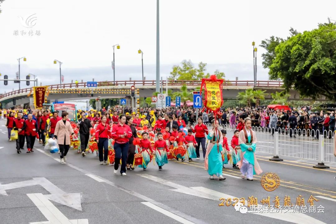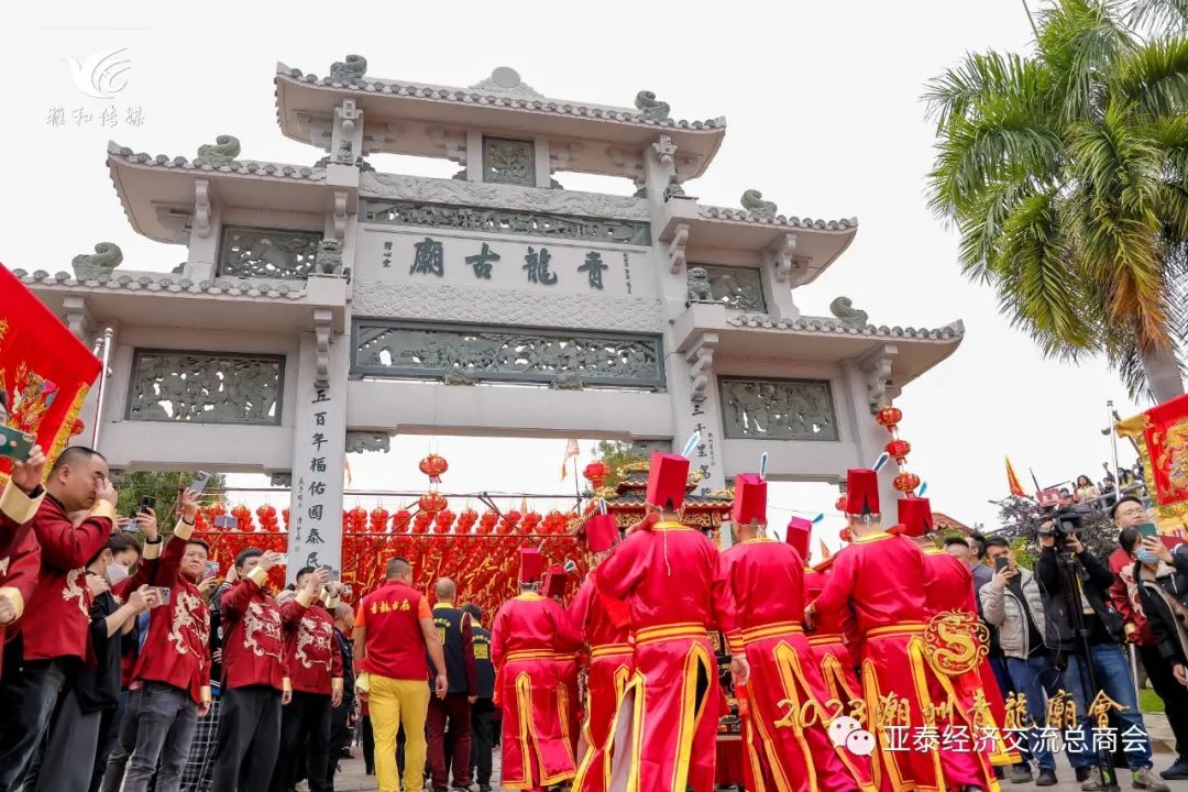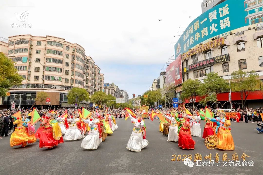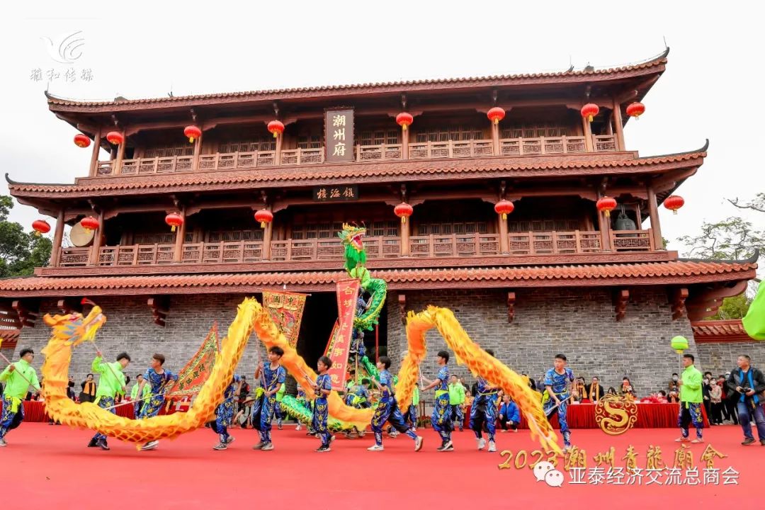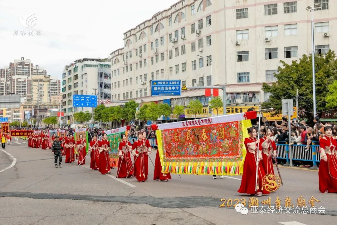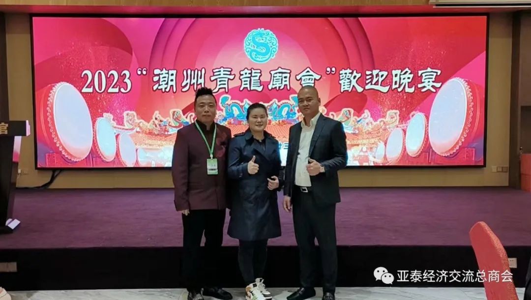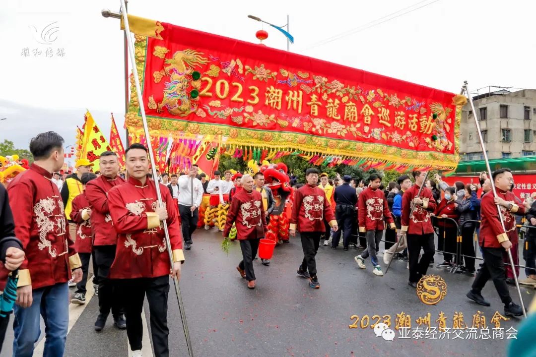 邱俊杰常务副会长、陈雪华常务理事在欢迎晚宴上与主办方合影留念 “潮州青龙庙会”是广东省非物质文化保护项目,旨在继承、发扬潮州民俗文化。2023年2月13-14日,潮州王伉传统文化研究会、青龙古庙理事会时隔九年再次在潮州举办2023“潮州青龙庙会”非遗公益文化巡游系列活动,邀请到海内外60多家社团会长及代表参加,俨然已发展成为国际性的宏大节庆。亚泰经济交流总商会以邱俊杰常务副会长、陈雪华常务理事为代表应邀出席是次盛会。邱俊杰常务副会长、陈雪华常务理事携亚泰商会旗帜参加巡游活动 13日下午,邱俊杰常务副会长和陈雪华常务理事抵达潮州金龙大酒店六楼金龙厅参加2023“潮州青龙庙会”欢迎晚宴,受到了主办方的热情接待。主办方在晚宴上向诸位嘉宾介绍了潮州青龙庙会的由来及发展历史。 14日上午,亚泰理事手持主办方特意准备的亚泰经济交流总商会旗帜参加巡游活动。文化巡游队伍由800多人组成,编队全长约1.5公里,沿途展示潮州传统民俗文化和非物质文化遗产,展现新时代潮州人的精神风貌及潮州文化的独特魅力,更全面展示潮州作为国家历史文化名城的城市底蕴。巡游队伍分为“新时代”、“传承”、“非物质文化遗产展示”、“潮韵”、“乡情”五个篇章十个表演方队,分别展示潮州高质量发展成果、英歌舞、布马舞、潮州大锣鼓、舞龙、舞狮、舞凤表演,以及潮州花灯、潮剧、标旗等。队伍从韩江之滨的青龙古庙出发,途经南桥市场、牌坊街、镇海楼、开元路、环城路、南较路、枫春路、南堤路,最终回到青龙古庙,巡游路线全长逾6公里,时长约4.5小时。应邀在镇海楼前观看活动的海内外嘉宾有300多人。巡游活动还吸引了近30万名群众沿途观看。 潮州市委市政府对本次文化巡游活动高度重视,派出公安执勤人员、区政府工作人员及志愿者约4000人,协助维护现场秩序,确保观众文明安全观看表演。 邱俊杰常务副会长在巡游活动结束后表示,我们作为旅泰潮人,这次有幸回乡参加青龙庙会,深切感受到家乡的飞速发展,以及对民俗文化传承的重视。今天亲眼目睹海内外乡亲共赴盛典,热闹非凡,深受感动,也非常感谢主办方的盛情邀请及工作人员的辛勤工作。我们在未来也会尽自己的一份力量,为建设家乡及搭建潮州-泰国经济、文化桥梁积极努力。