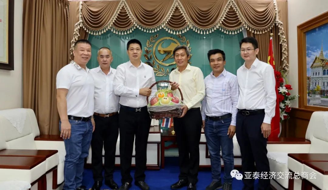 接待仪式上,宾主互赠见面礼品,乌提蓬议员向李胜交会长赠送果篮,陈锦潮执行会长则代表商会回赠一份亚泰特制专用酒予乌提蓬议员。随后双方在会客厅进行了亲切交谈。 乌提蓬议员首先说道,去年李胜交会长原本计划亲自带队前往乌汶府看望受灾民众并分发救灾物资,很可惜所搭乘航班遭遇强气流无法在乌汶机场降落,只能委托乌提蓬议员及其他当地官员代为发放。后续在走访受惠灾民时,大家纷纷委托我有机会一定要把大家的感激之情转达给亚泰理事们。这次我来曼谷,第一站就是来拜访亚泰商会,转述百姓们的心声。 李胜交会长对乌提蓬议员一行的到访表示了欢迎。他说道,亚泰商会一贯秉承着积极回馈所在国的理念。虽然我们能力有限,但只要泰国有需要,都会尽自己的能力帮助这片土地。 随后乌提蓬议员提到,之前亚泰商会捐赠款项还有剩余,此番前来也是想和理事们探讨款项用途。最终双方一致同意在乌汶府寺庙建造大型凉亭一座,用于当地居民日常乘凉及开展集会等。 因乌提蓬议员此次来曼谷行程紧密,11时许既告辞离开,临行前宾主双方亲切合影留念。![]()