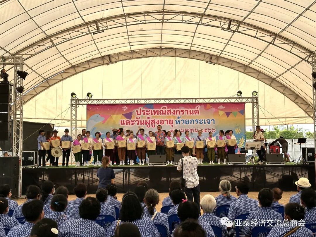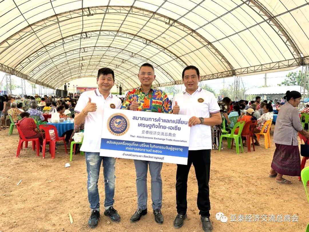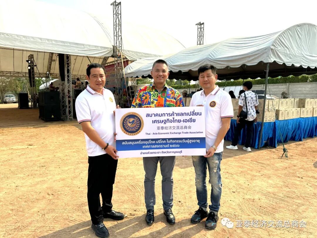 2023年4月13日是泰国的传统新年宋干节(俗称泼水节),同时也是泰国的老年节。泰国国防部定于节日前夕,即12日前往北碧府惠卡昭县举办老年节庆祝活动,由泰国国防部次长参谋主任、本会名誉顾问塔纳帕·倪雅军上将向亚泰经济交流总商会会长李胜交先生及全体理事发来邀请,因李胜交会长身在国内出差,特委派梁建军发展部主任、蔡锋理事及余天炀总干事出席参加是次活动,并由商会捐资15万泰铢予国防部统一采购生活物资礼品包,分发给参加活动的老年人,以彰尊老敬老之美德。