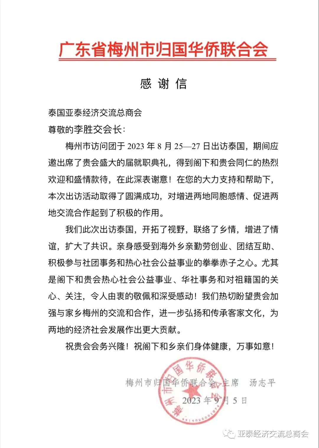 梅州市访问团于2023年8月25-27日出访泰国,期间应邀出席了贵会盛大的届就职典礼,得到阁下和贵会同仁的热烈欢迎和盛情款待,在此深表谢意!在您的大力支持和帮助下,本次出访活动取得了圆满成功,对增进两地同胞感情、促进两地交流合作起到了积极的作用。