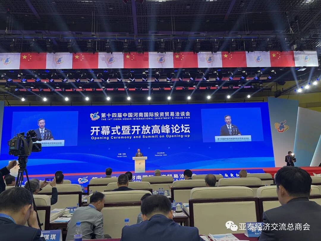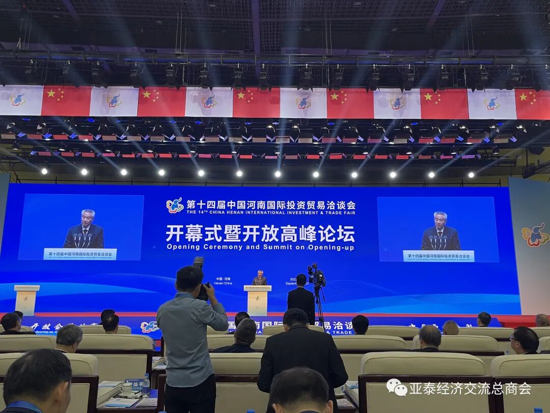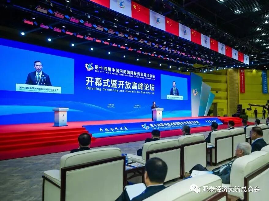 由河南省人民政府、国家商务部、中国国际贸易促进委员会、中国人民对外友好协会联合主办、为河南省规模最大、规格最高、最具影响力的第十四届中国河南国际投资贸易洽谈会于9月26日在郑州市国际会展中心隆重开幕。全国政协副主席邵鸿致辞并宣布开幕、河南省委书记楼阳生出席开幕仪式并致辞、大会由河南省省长王凯主持。河南省中豫建投集团党委书记、董事长高山林、党委副书记、工会主席程凯、中管世纪集团董事长吴文辉(本会名誉会长)、产投公司董事长李青原、亚泰经济交流总商会会长、泰国金链花集团董事长李胜交偕同商会助理会长姚小勇、甄宗华应邀参加。