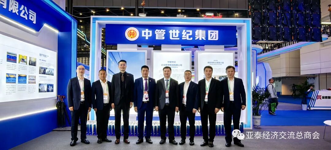 高山林董事长、程凯主席、吴文辉董事长、李青原董事长、李胜交会长、姚小勇助理会长、甄宗华助理会长等在中管世纪集团展位前合影。