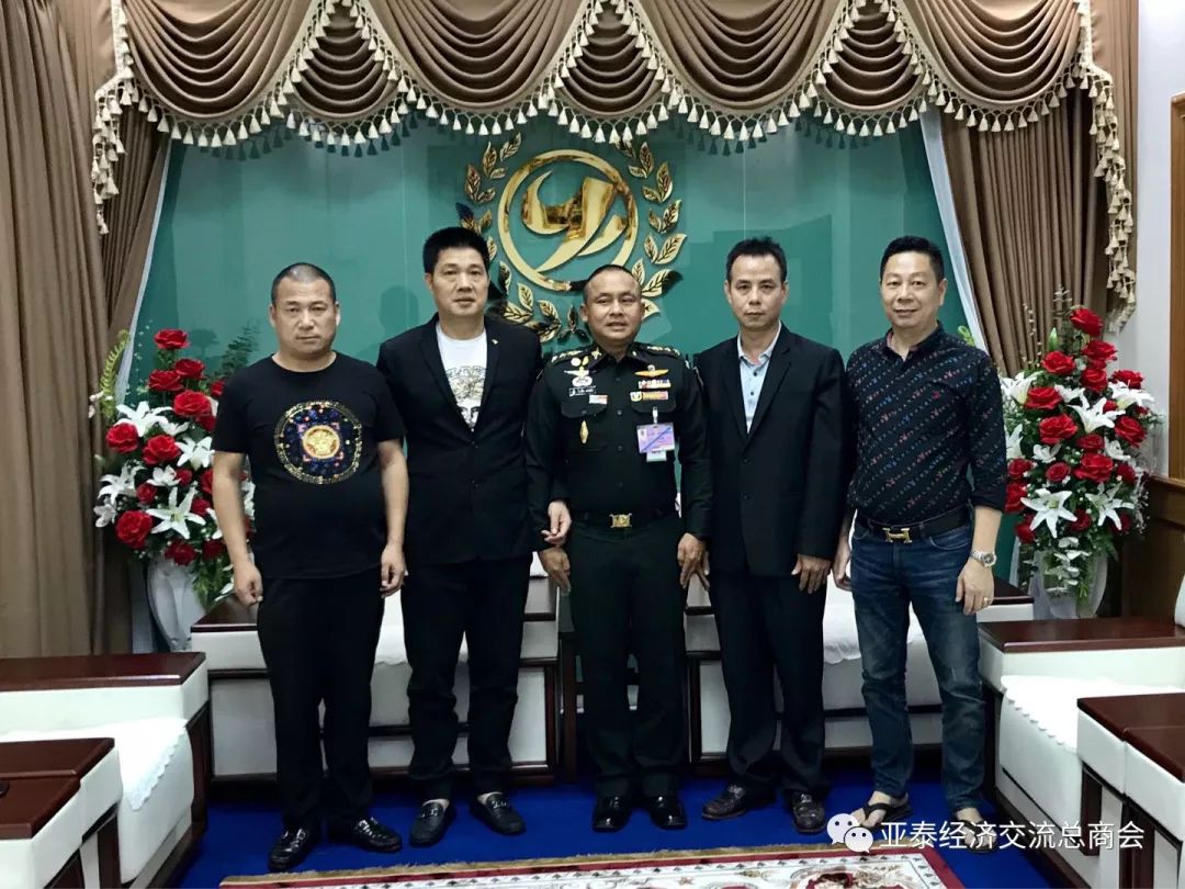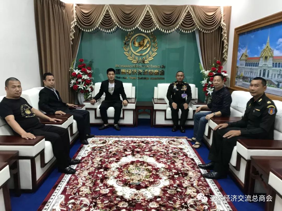 威拉猜上校抵达亚泰经济交流总商会时,受到李胜交会长偕常务副会长郑友民,会长助理黄伟,办公室主任姚小勇等的热烈欢迎。在简单的欢迎仪式上,威拉猜特级上校首先向李胜交会长献花篮表示祝贺。随后,李胜交会长在会客厅热情的接待威拉猜特级上校,因为是相识多年的老朋友,双方彼此都没有讲客套话,大家欢快的交谈,真情表达,场面非常亲切温馨。威拉猜特级上校指出,前段时间就闻知李会长创立商会之事,只因工作上的原因,直到今天才有时间过来拜访和祝贺,他表示今后将尽量多争取时间联系,并会尽心尽力支持亚泰经济交流总商会会务发展,为促进泰中经济交流作出积极贡献。