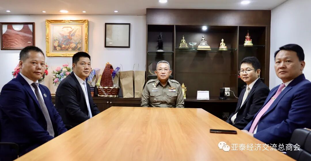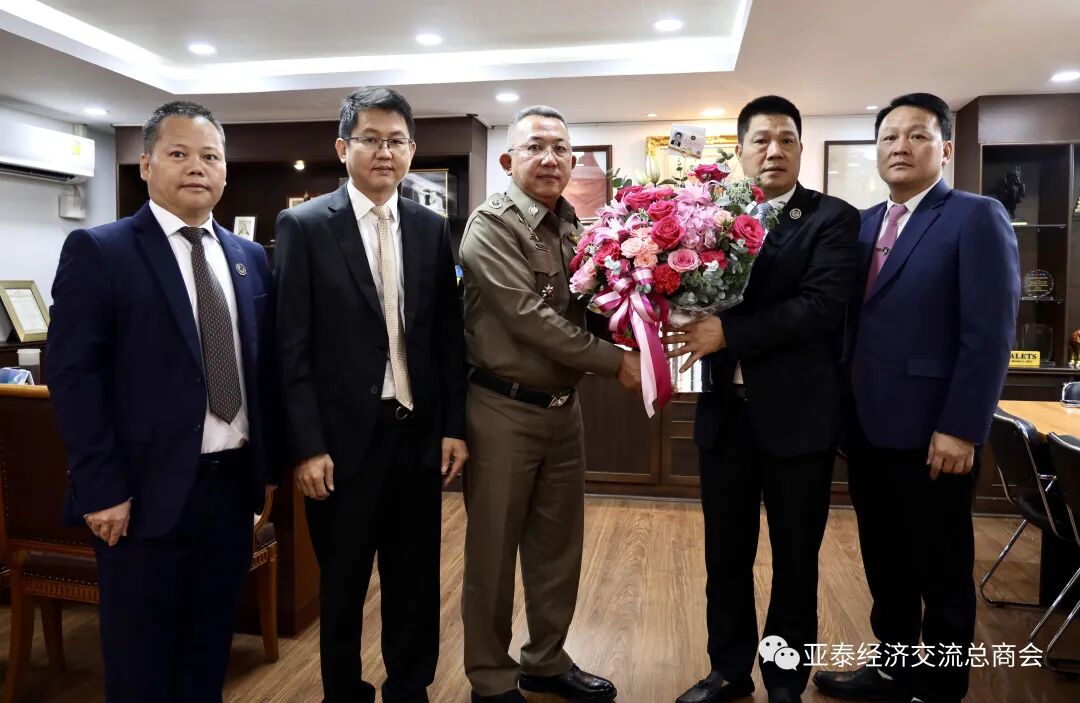 2023年11月22日(星期三)下午,亚泰经济交流总商会会长李胜交率执行会长陈锦潮,副会长许明杰,常务理事杨红波一行,前往曼谷第九区警察局,拜访局长巴颂•安玛龙警少将,受到巴颂警少将热情接待,双方亲切座谈交流。
