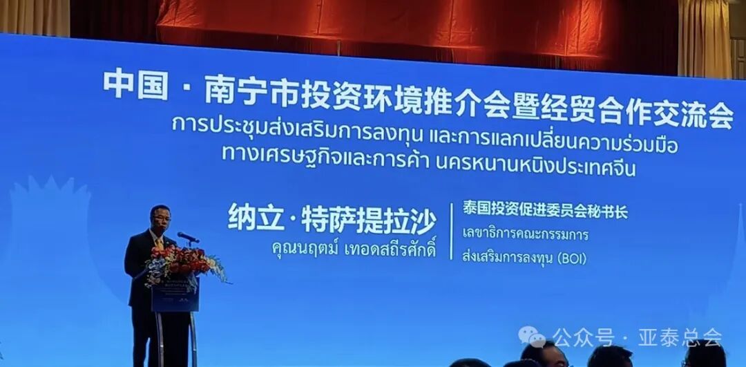副总理兼商长普坦,工业部长萍帕拉,投促委秘书长纳立,中总主席林楚钦先后致词,指出南宁是中国西南地区重要经济中心之一,也是中国面向东盟开放的桥头堡。泰国是东盟中心国家和“一带一路”节点地区,是中国企业家理想投资国家。泰国政府高度重视与中国开展各项合作,两国在各领域的合作将有飞跃发展。目前,泰国是广西第四大外贸伙伴。欢迎更多的中国企业家来泰考察投资兴业,共同进步繁荣。南宁市副市长范晓敏介绍南宁市概况及投资环境。工信局长卢晴介绍南宁市新能源汽车及零配件产业与东盟合作发展趋势。会上,泰中企业签署了合作协议。