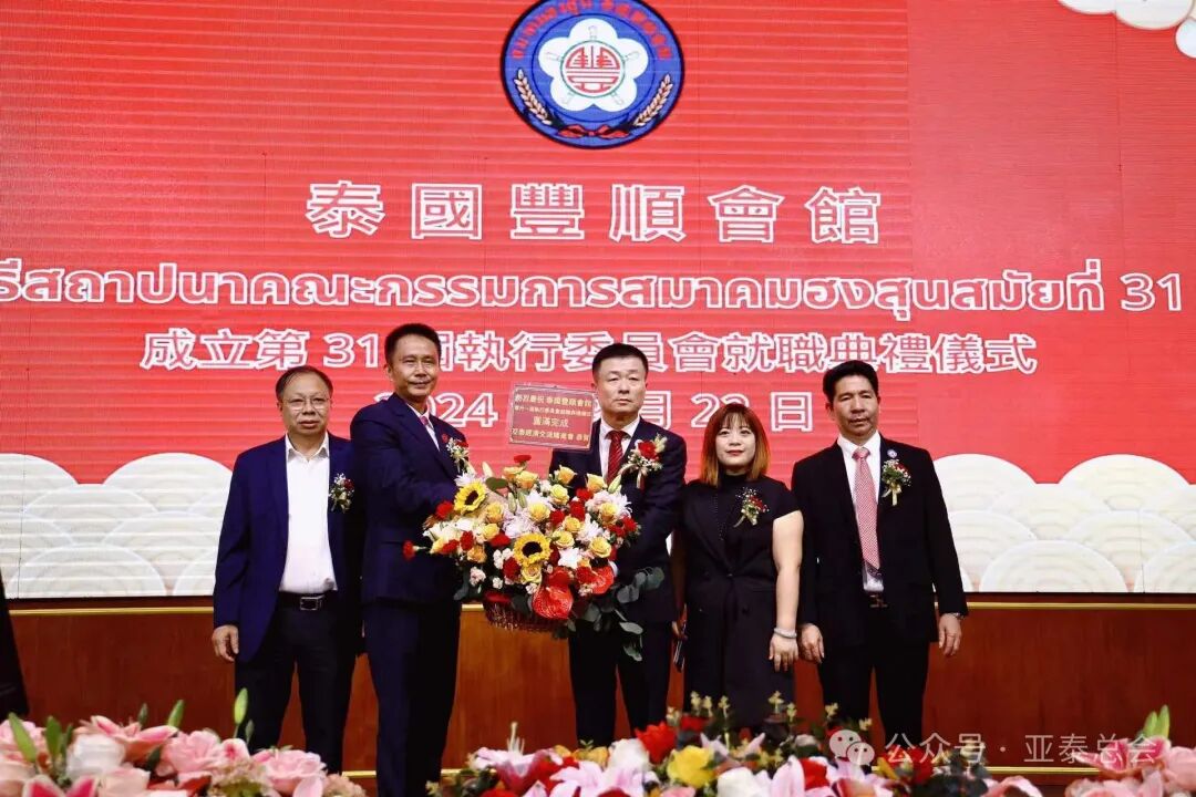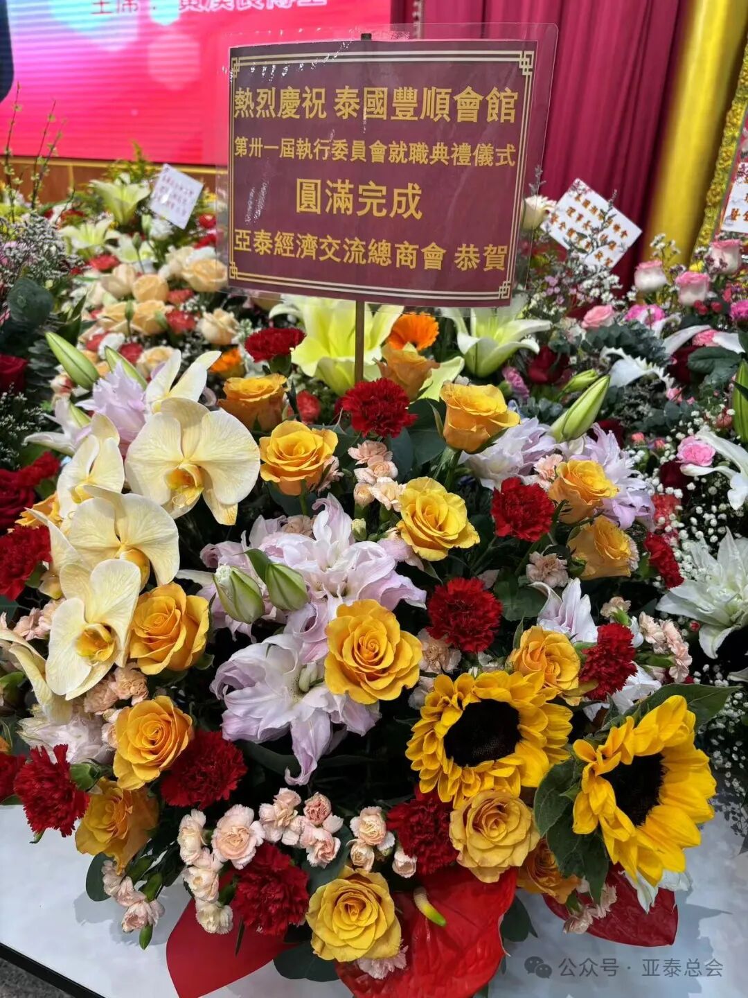 在祝贺仪式中,各大商会代表纷纷献上花篮表达祝福。亚泰经济交流总商会特别表达了对丰顺会馆的殷切期望,衷心祝愿丰顺会馆在徐永添主席及新一届执委会的领导下,不仅能传承丰顺会馆优良传统,还能在未来的发展中勇攀新高峰。亚泰商会期待与丰顺会馆在促进中泰经济文化交流、推动商界合作方面继续携手共进。我们坚信,丰顺会馆的未来必将更加辉煌,不仅在泰中两国的商业合作中发挥更大作用,更会为两国人民的友谊谱写新的篇章。