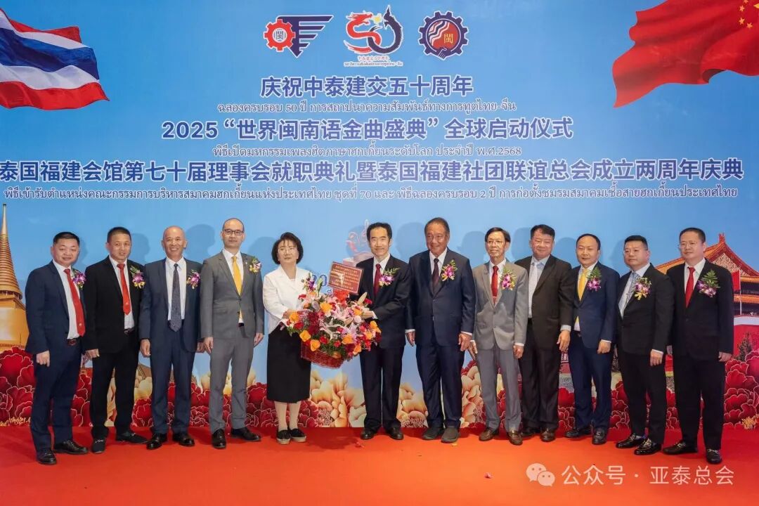 2025年3月15日,庆祝中泰建交五十周年“世界闽南语金曲盛典”全球启动仪式、泰国福建会馆第七十届理事会就职典礼暨泰国福建社团联谊总会成立两周年庆典在泰国中华总商会光华堂隆重举行。本次盛会汇聚了来自泰国、中国及全球各地的闽籍乡贤、侨领及社会各界人士,共同见证这一历史性时刻。亚泰经济交流总商会副会长刘瑛、金瑞鑫会长助理等受邀出席,展现了总商会对中泰友好交流及闽南文化传承的高度重视。