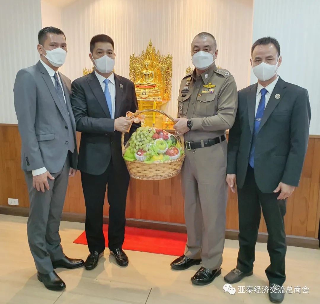 4月12日上午10时,亚泰经济交流总商会李胜交会长偕同常务副会长郑友民、总干事余天炀等携水果篮赴国家警察总署第五办公楼九楼,向本会名誉顾问、国家警察总署人事任用管理办公室最高指挥官亿提蓬警中将祝贺泰国传统节日——宋干节的到来,并祝福他新年快乐、身体健康、工作顺利、阖家幸福、步步高升!