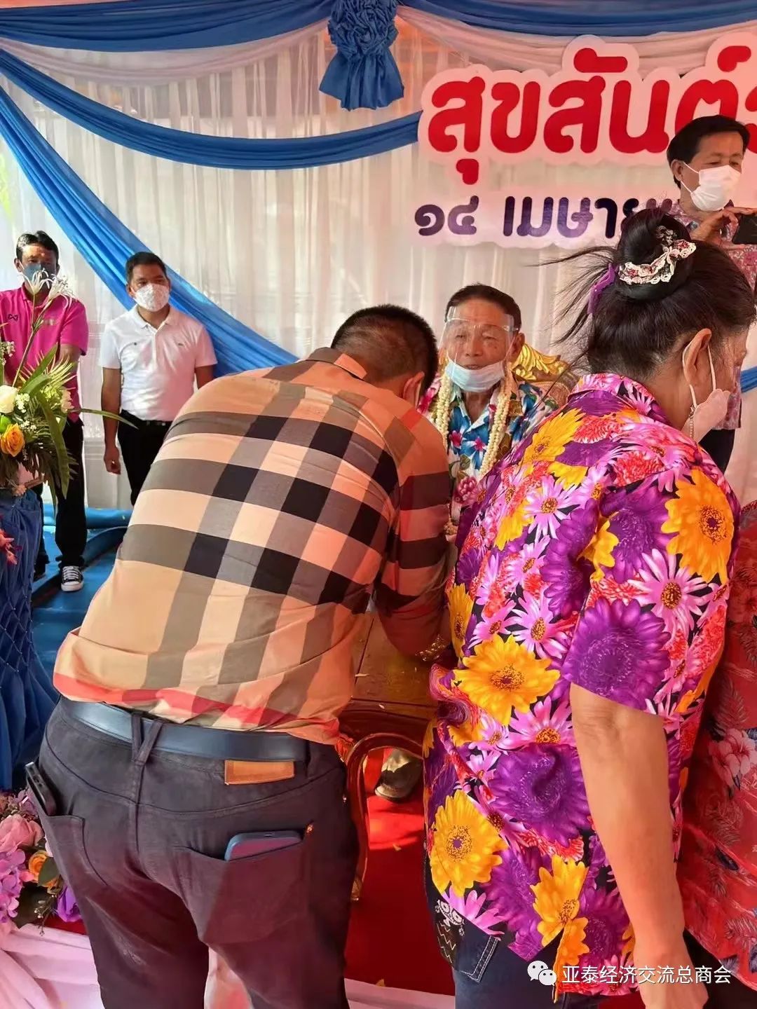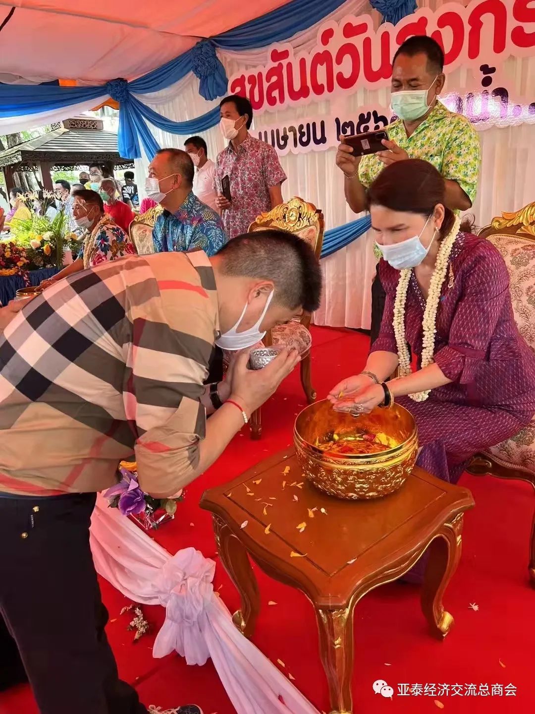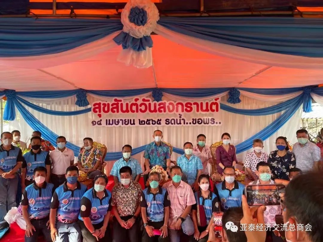 而查霖猜部长和其他长辈,也相继为李胜交会长等洒水祈福,象征长辈对晚辈(或年长对年少)的关爱、照顾之意。祝福新年快乐、事业兴旺、阖家幸福!查霖猜部长同时也通过李胜交会长转达他对亚泰经济交流总商会全体理事同仁的节日亲切问候!祝亚泰会务顺利发展,突飞猛进,并希望亚泰继续发挥积极作用,为促进泰中两国经济、文化等领域交流贡献力量!