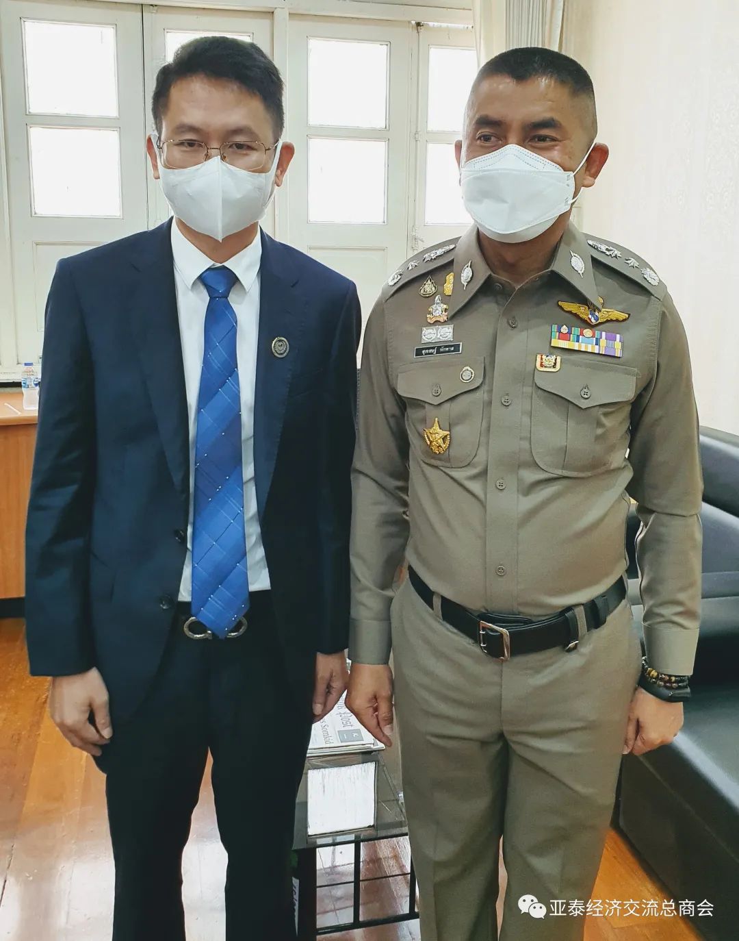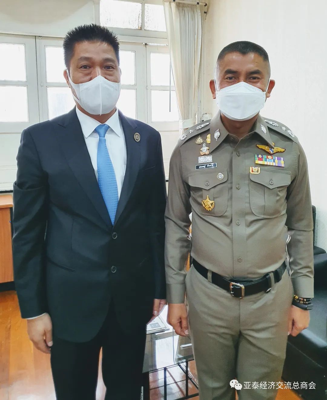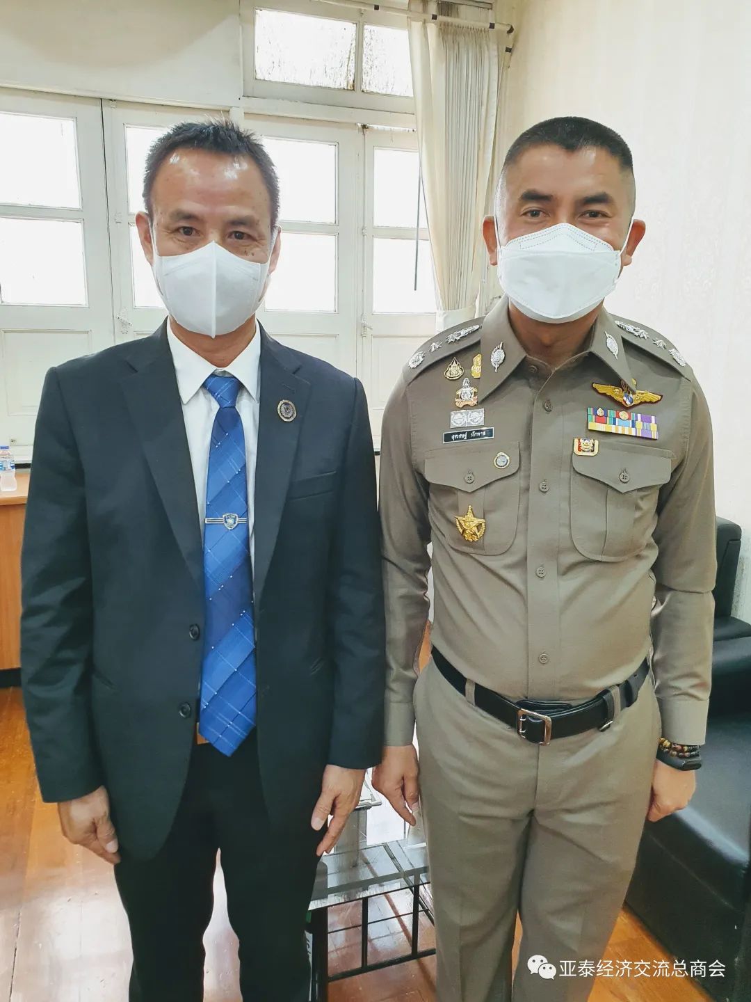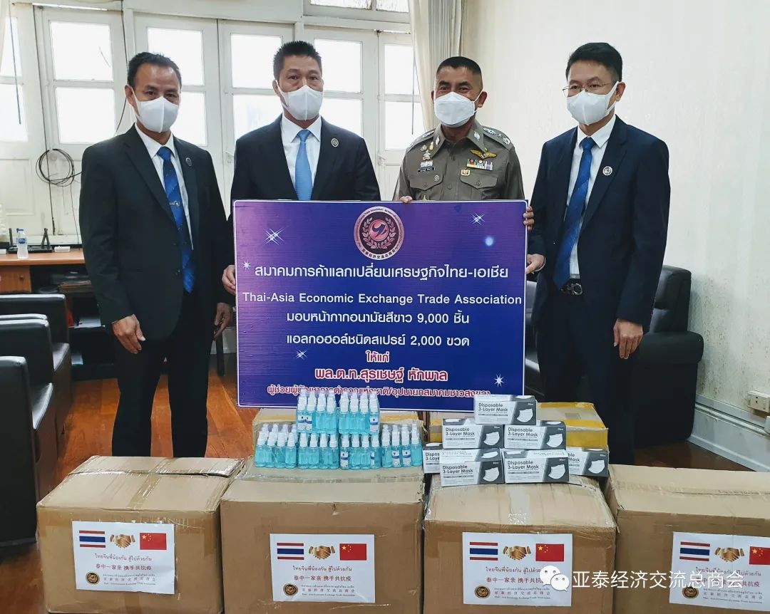 2019年4月21日上午,亚泰经济交流总商会会长李胜交、执行会长陈锦潮、常务副会长郑友民及总干事余天炀前往泰国警察总署拜会助理总署长素拉切警中将,同时带去首批抗疫物资,包括口罩9000个(李胜交会长、陈锦潮执行会长私人捐赠)及酒精喷雾消毒液等。