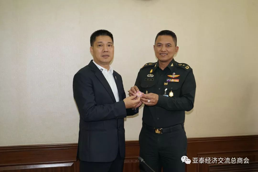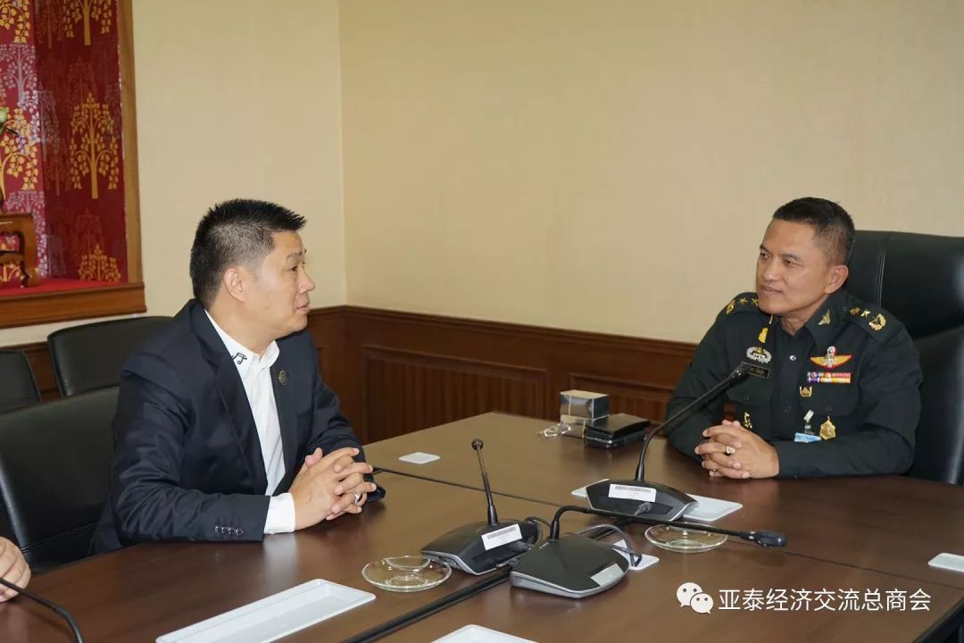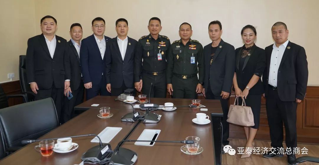 亚泰经济交流总商会会长李胜交率领常务副会长郑友民,副会长孙凯、黄五好,秘书长袁冰,会长助理黄伟,办公室主任姚小勇一行,于2019年4月10日(星期三)下午专诚前往拜会国防部参谋长助理、我会顾问塔纳帕中将;受到塔纳帕中将和国防部次长办公室主任蓬维上校的热情迎接,宾主进行亲切座谈。李胜交会长讲到,首先衷心感谢塔那帕中将顾问及蓬维上校在公务繁忙之中,抽出宝贵时间接待我们;今天来拜会将军,首先是对塔纳帕将军前一阵子莅临商会视察指导的回访;第二,汇报一下我会筹备举办成立就职典礼的进度情况。第三,聆听将军的指导,俾作为商会今后开展具体工作活动的指南。