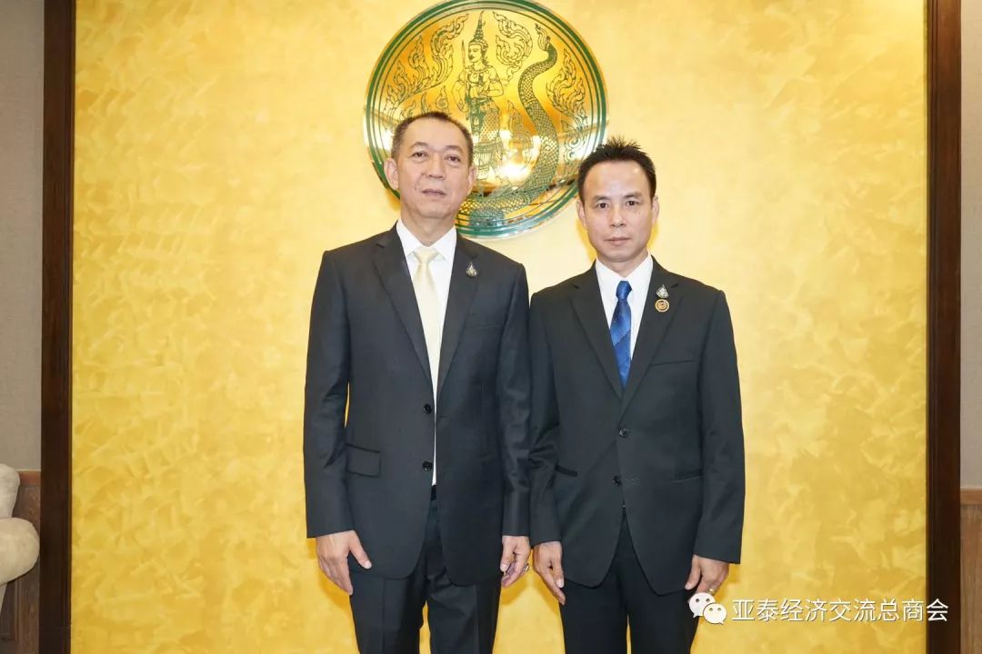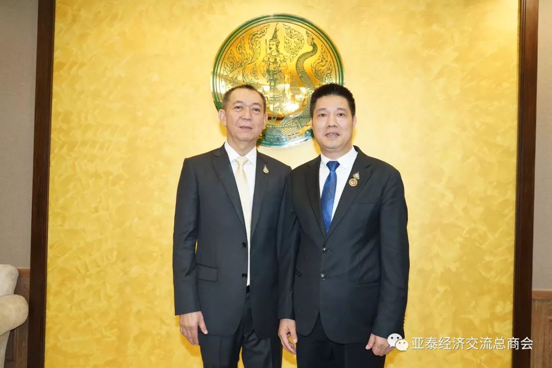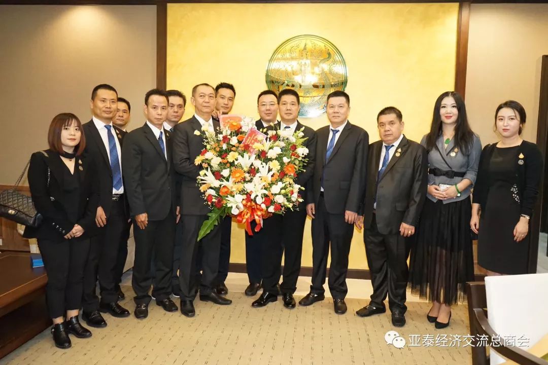 2019年7月18日上午九时,亚泰经济交流总商会李胜交会长率领常务副会长郑友民、陈英铭,副会长陈子震、王金媛、孙凯,会长助理陈培桐、杨莉、黄伟、蔡礼剑,副秘书长陈乐,常务理事朱冬雷,理事王磊一行,前往泰国农业与合作社部,向宠蒙皇上玛哈哇栖拉隆功陛下恩赐谕任农业与合作社部部长的查霖猜(李金朵)阁下及副部长探玛纳博士献鲜花致敬,衷心祝贺查霖猜农合部长和探玛纳副部长:英才大展造福家邦、鸿志得酬辅政导民!同时再次感谢两位领导人7月13日晚亲临香格里拉大酒店,主持亚泰经济交流总商会成立暨首届理事会就职典礼。查霖猜部长、探玛纳副部长热情接待李胜交会长一行,双方亲切交谈,气氛轻松愉快,场面温馨感人!