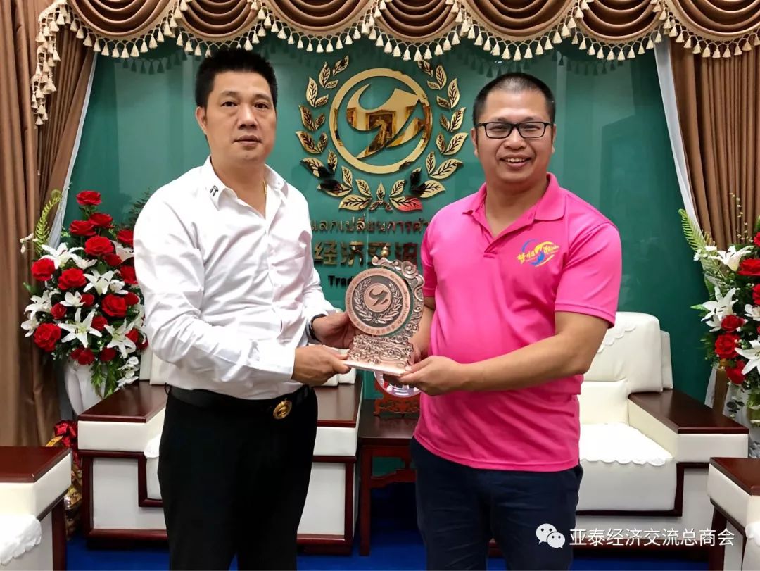李胜交会长致词,欢迎杨经纬副会长带队到泰国走访调研,可谓任重道远,精神可嘉。本会理事成员以潮汕、客家人为主体,同时涵盖中国大陆各地;大家"携手同进、共求发展",以促进泰中及亚洲各国经济文化交流为己任。贵团队在泰期间,如有需要本会协助的地方请告诉我们,大家都是胶地人不要客气。祝贵团队走访调研活动顺利成功!宾主互赠礼物并合照留念